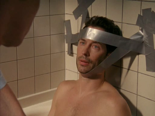 - Als Dan aus der Badewanne auftaucht sieht man dass er mit Badehose badet.