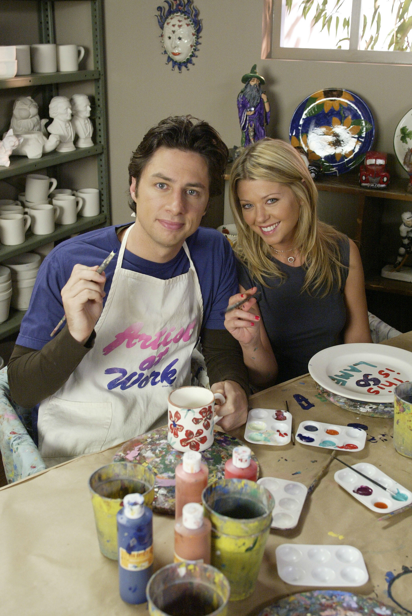 Their first date in a ceramics decorating shop... J.D. looks over at Danni's creation, a plate on which she's painted "This Is So Lame".