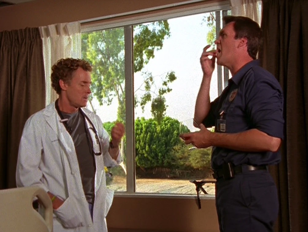 [Janitor gives Dr. Cox a tablet, and on three the Janitor swallows his]